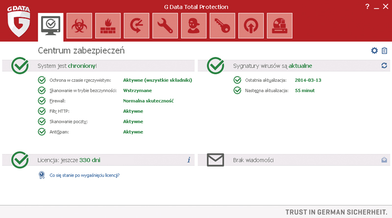 Kompletny pakiet bezpieczeństwa dla ochrony twoich danych i bezproblemowej pracy na komputerzeG Data TOTAL PROTECTION to kompletny pakiet bezpieczeństwa dla ochrony twoich danych i bezproblemowej pracy na komputerze. Maksimum ochrony! G Data TotalProtection chroni Cię nie tylko przed wirusami, trojanami czy hakerskimi atakami, ale dzięki dodatkowym modułom jak Sejf zabezpiecza także Twoje najcenniejsze dane. To właśnie jest #GERMANSICHERHEITh